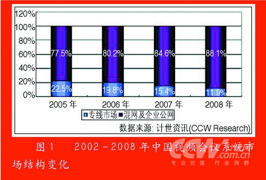 從市場(chǎng)結(jié)構(gòu)上看,混網(wǎng)及Internet軟件視頻會(huì)議系統(tǒng)市場(chǎng)已經(jīng)形成了對(duì)專線市場(chǎng)的主導(dǎo)地位的挑戰(zhàn),僅2004年,專線市場(chǎng)就比2003年下降了19.5個(gè)百分點(diǎn),到2005年混網(wǎng)及企業(yè)公網(wǎng)市場(chǎng)份額達(dá)到77.5%,而在2006年,混網(wǎng)及Internet視頻會(huì)議系統(tǒng)已經(jīng)達(dá)到80.2%的市場(chǎng)占有率,基本占據(jù)了市場(chǎng)的主導(dǎo)地位。