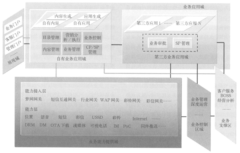 。1)業(yè)務能力系統(tǒng)。該部分包括具有實現(xiàn)各應用功能的能力提供系統(tǒng),如短信、WAP等,可提供用戶使用業(yè)務功能的實現(xiàn)通道。