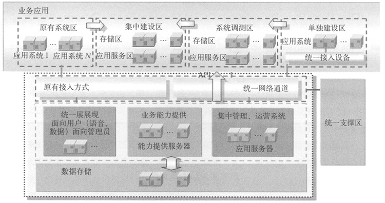 。5)應用業(yè)務區(qū):統(tǒng)一搭建應用硬件平臺,實現(xiàn)應用業(yè)務區(qū)業(yè)務應用及業(yè)務能力提供區(qū)接入通道類型的新增,均可直接在其硬件平臺上加載應用軟件、提供服務,調用現(xiàn)有資源實現(xiàn)。個別因為系統(tǒng)本身需求需要單獨建設、部署的系統(tǒng)則保留其單獨建設的方式。