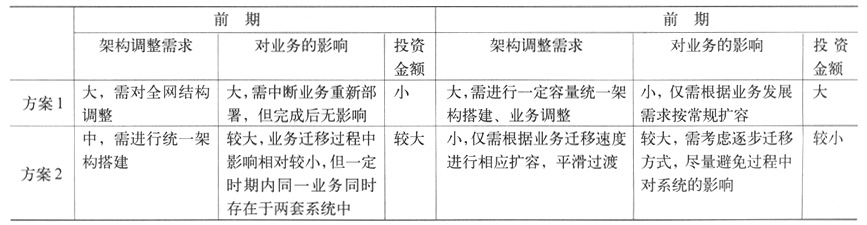 根據網絡演進架構清晰度、實施難度、投資金額等綜合因素考慮,對以上方案分析對比如表1所示。