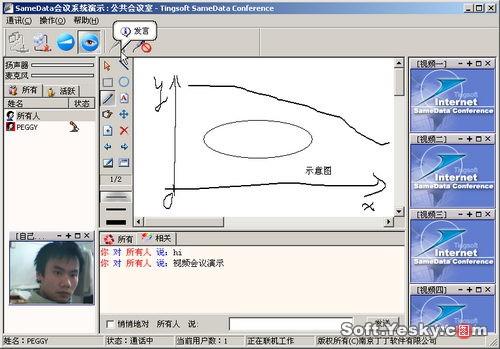 可以看到該系統(tǒng)提供了多路視頻展示與共享文檔顯示區(qū)、文本交流、文檔共享、語音交流等多種交互手段,各用戶可以在主席的協(xié)調(diào)下使用各項功能輕松地實(shí)現(xiàn)實(shí)時交流與網(wǎng)絡(luò)協(xié)作。
