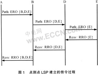 Switching Path)建立的信令過程。當(dāng)入口標(biāo)記交換路由器(LSR:Label Switching Router)A接收到一個(gè)業(yè)務(wù)請求后,它根據(jù)路由控制模塊計(jì)算出來的路由填寫顯示路由對象(ERO:Explicit