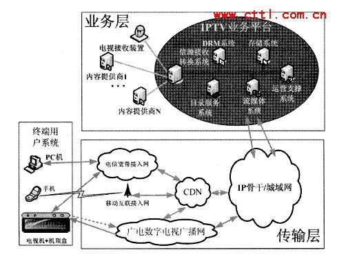 從上面的分析中可以看出。IPTV業(yè)務(wù)平臺(tái)具有明顯的NGN業(yè)務(wù)層特征,屬于NGN業(yè)務(wù)層部分;IPTV傳輸網(wǎng)絡(luò)具有明顯的NGN傳輸層特征,屬于NGN傳輸層部分;IPTV用戶終端設(shè)備具有明顯的NGN用戶終端特征。屬于NGN用戶終端部分。