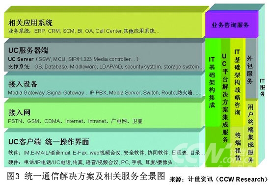 計世資訊(CCW Research)認為,統(tǒng)一通信和我們通常所說的統(tǒng)一通信解決方案是同一個意思,它不是特指一種新的技術,而是指特定的解決方案和應用,通過對各種溝通方式進行融合,無論使用者在任何時候、任何地點、從任何設備上都能從一個“單一的界面”訪問其所需的應用和信息,達到降低溝通成本和提高工作效率的目標。