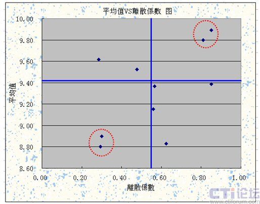 利用散點圖很容易找出我們的內(nèi)部標(biāo)竿,例如下面這張圖是每個班組小休率在12月份的平均值和離散系數(shù),可以清楚的看到,這四個象線的左下角,有兩個班組的小休率的平均值低于9以下,有一個班組甚至在8.8左右,這兩個班組不只是平均值最低,而且在12月份每一天的小休率也是控管的最好,差異是最小的。