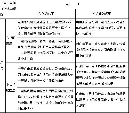 由博弈矩陣可以看出,廣電對于IPTV將處于一個兩難的境地,完全合作與完全不合作都不符合廣電的利益,因此采取有限的合作態(tài)度,利用手中的監(jiān)管權(quán)力限制電信的擴(kuò)張將是廣電理所當(dāng)然的選擇。而電信則顯得比較被動,就目前來講,爭取獲得IPTV的牌照是電信方面最關(guān)心的問題。