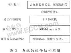 在系統(tǒng)硬件完成后,剩下的需要大量丁作來(lái)編寫代碼實(shí)現(xiàn)各個(gè)功能模塊,最終實(shí)現(xiàn)整個(gè)系統(tǒng)。系統(tǒng)的軟件結(jié)構(gòu)如圖2所示。嵌入式OS是采用ARM-Linux內(nèi)核,硬件驅(qū)動(dòng)模塊主要是基于ARM