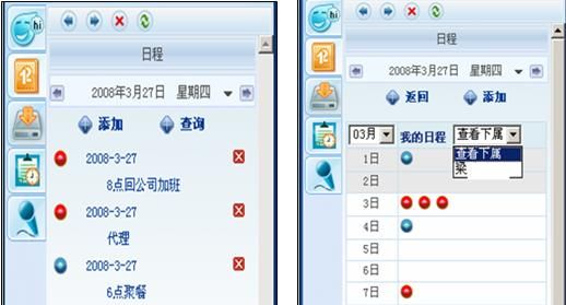 我們用過OUTLOOK的電子日程和手機自帶的日程功能都知道,電腦本機和手機實現(xiàn)日程管理都又各自很大的局限性,優(yōu)你客巧妙的實現(xiàn)了日程的網(wǎng)絡化管理并可以捆綁在手機提醒上,獨特又實用。其中紅綠日程各自代表工作和個人事務,其中工作日程還能共享給上級。