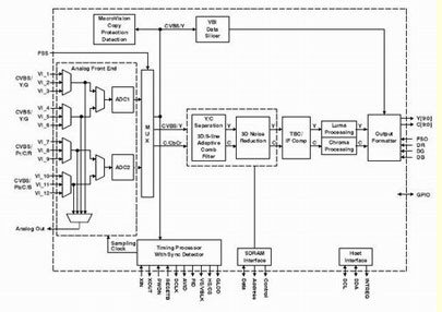 圖2所示為視頻解碼器的數(shù)據(jù)流路徑,它負責處理NTSC、PAL、SECAM、S-Video、SCART、YPbPr、RGB、480p和其它輸入格式。在數(shù)字電視中,對這種級別的靈活性的支持是必需的,完全是為了讓一個機型經(jīng)過實際設置可以工作于任何格式。數(shù)字電視解碼器的典型性能特征包括:同步、消隱、場、有源視頻窗口、水平和垂直同步、時鐘、同步鎖相(用于下行視頻編碼同步)、主CPU中斷和可編程邏輯I/O信號。這是對數(shù)字視頻輸出以及用于先進的垂直消隱期(VBI)數(shù)據(jù)恢復的補充。作為一種附加功能,一些視頻解碼器支持VBI數(shù)據(jù)處理器(VDP)在文字電視廣播、傳送字幕(CC)和其它VBI數(shù)據(jù)上進行數(shù)據(jù)分片、解析和執(zhí)行誤碼校驗。內(nèi)置的FIFO存儲多達11行文字電視廣播數(shù)據(jù),而適當?shù)闹鹘涌谕郊叭聊晃淖蛛娨晱V播恢復是當今系統(tǒng)中的幾個常見要求。然而,一些實現(xiàn)方案需要一種解碼器,它能夠為基于主CPU的VBI處理提供速度為已采樣原始亮度數(shù)據(jù)兩倍的輸出格式化數(shù)據(jù)。