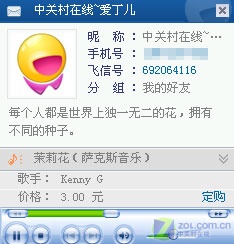請(qǐng)注意看圖4的下方,在兩個(gè)好友昵稱(chēng)方均顯示有一行藍(lán)色文字,分別是“今天你要嫁給我”和“茉莉花”。知道這兩行藍(lán)色文字代表什么嘛?這是你的好友用戶(hù)當(dāng)前所擁有的彩鈴。