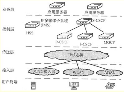 IMS使用會話發(fā)起協(xié)議(SIP)作為建立、控制、修改和終止兩個或者更多個參與者之間的語音、視頻和消息等會話的信令協(xié)議。在IMS中,與SIP相關(guān)的信令點稱為呼叫狀態(tài)控制功能信令點,并且根據(jù)它們功能的不同而有所區(qū)分。IMS中與鑒權(quán)、授權(quán)、計費相關(guān)的功能基于IETF、Diameter協(xié)議,是在HSS、CSCF等IMS組件上實現(xiàn)的,提供業(yè)務(wù)收費功能。HSS是與用戶和服務(wù)相關(guān)的數(shù)據(jù)的主要存儲器,由2G移動通信網(wǎng)的HLR演進(jìn)而來。業(yè)務(wù)層上的應(yīng)用服務(wù)器提供各種業(yè)務(wù)邏輯,實現(xiàn)多種電信增值業(yè)務(wù)。傳送層的IP核心網(wǎng)是IMS業(yè)務(wù)的統(tǒng)一承載網(wǎng)絡(luò)。接入層提供包括2G、3G(UMTS、cdma2000)、WLAN、ADSL等在內(nèi)的多種接入方式。