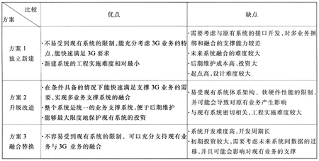 由于國內電信運營商一般已建有業(yè)務支撐系統(tǒng),因此在進入到3G時代后就面臨著如何選擇3G融合計費系統(tǒng)建設方式的問題。3G融合計費系統(tǒng)的建設方案主要有獨立新建、升級改造、融合替換三種。三種不同的建設方案對比分析見表2。