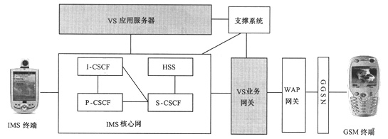 由于GSM網(wǎng)絡(luò)不可能立刻被替換掉,因此在一段時(shí)期內(nèi)會(huì)出現(xiàn)3G IMS網(wǎng)絡(luò)和GSM網(wǎng)絡(luò)共存的局面。VS作為IMS中的典型業(yè)務(wù)將隨著IMS網(wǎng)絡(luò)的部署得到大力推廣,此時(shí)會(huì)出現(xiàn)基于SIP協(xié)議的IMS終端用戶(hù)和GSM用戶(hù)終端進(jìn)行VS業(yè)務(wù)互通的需求,下文將對(duì)這種業(yè)務(wù)需求的實(shí)現(xiàn)方案進(jìn)行詳細(xì)介紹。