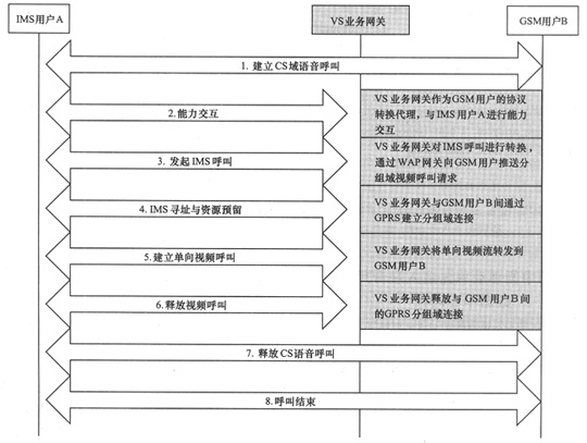 上述業(yè)務(wù)場(chǎng)景是被叫GSM用戶(hù)B在線(xiàn)的情況,如果用戶(hù)B不在線(xiàn),IMS用戶(hù)A也可向用戶(hù)B發(fā)起VS業(yè)務(wù)請(qǐng)求,共享的視頻業(yè)務(wù)將首先被存放在VS應(yīng)用服務(wù)器上,一旦用戶(hù)B上線(xiàn),視頻片段將由VS應(yīng)用服務(wù)器通過(guò)VS業(yè)務(wù)網(wǎng)關(guān)推送到GSM用戶(hù)B終端上。