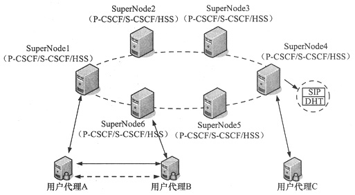 IMS網(wǎng)絡(luò)中的功能實(shí)體基本一致,但二者可以和基于DHT的HSS功能集成在一個(gè)物理實(shí)體,使得網(wǎng)絡(luò)控制層的功能能夠均質(zhì)化,同時(shí),由于分布式IMS系統(tǒng)中的用戶簽約信息存儲(chǔ)在基于DHT的HSS中,可以使用DHT算法快速定位用戶所在的SuperNode,進(jìn)而可以優(yōu)化網(wǎng)絡(luò)的路由。