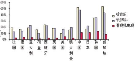 除打電話、發(fā)短信、拍照、手機(jī)郵箱以外,音樂、游戲也是用戶每周使用較多的業(yè)務(wù)。當(dāng)被問及其它應(yīng)用時,來自中國、新加坡還有韓國的部分被調(diào)查者表示,他們會經(jīng)常用手機(jī)來聽音樂和玩游戲。其中,中國是惟一一個選擇用手機(jī)聽音樂的用戶數(shù)與選擇用手機(jī)拍照的用戶數(shù)旗鼓相當(dāng)?shù)膰摇5腥さ氖,手機(jī)在中國不太可能成為MP3的替代品,仍然只是一個便攜播放器。在新加坡,手機(jī)替代MP3的可能性就大多了。Ovum認(rèn)為,這是由于高端手機(jī)在新加坡市場占有很高的比例。在歐洲和美國,使用手機(jī)來聽音樂和玩游戲的比例則比亞洲少了很多,但值得鼓勵的是仍有超過10%的被調(diào)查者選擇了該答案。(見圖2)