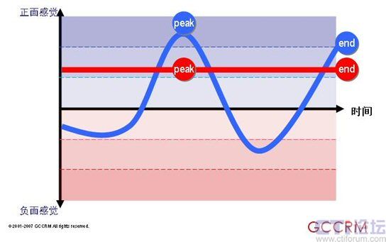 紅色情感曲線代表旨在提供全面理想體驗(yàn)的傳統(tǒng)方法。藍(lán)色情感曲線反映的是一種資源分配的新方法,它專注于峰值和終了這兩個(gè)關(guān)鍵點(diǎn)同時(shí)將剩余子流程的表現(xiàn)控制在平均水平之下。看似效率較低的那個(gè)(藍(lán)色情感曲線)