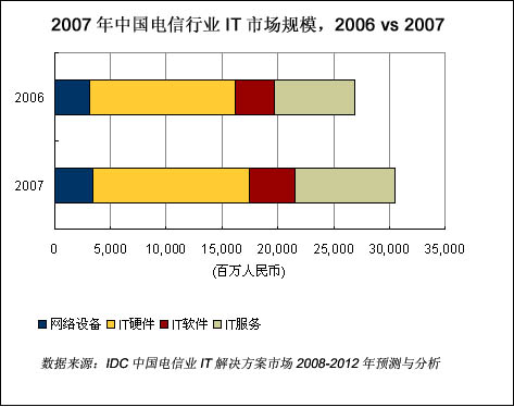 IDC《中國電信行業(yè)IT解決方案市場2008-2012年預(yù)測與分析》報告的數(shù)據(jù)顯示,2007年中國電信行業(yè)整體IT支出規(guī)模為305.02億元人民幣,比2006年增長了13.2%。2007年電信行業(yè)IT運(yùn)營支撐系統(tǒng)和增值業(yè)務(wù)系統(tǒng)的高速增長主要是由于運(yùn)營商都在為3G的實施和全業(yè)務(wù)運(yùn)營做準(zhǔn)備。