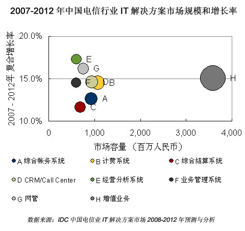 IDC預(yù)計,2007-2012年電信行業(yè)將注重運(yùn)營支撐系統(tǒng)的全業(yè)務(wù)運(yùn)營整合和支持前端業(yè)務(wù),因此3G增值業(yè)務(wù)、經(jīng)營分析系統(tǒng)、客戶關(guān)系管理系統(tǒng)、IT服務(wù)管理系統(tǒng)等建設(shè)將實現(xiàn)快速增長。已有項目仍然會持續(xù)升級維護(hù),以及配合全業(yè)務(wù)運(yùn)營作出功能上的提升。2007年電信IT應(yīng)用解決方案(僅含解決方案供應(yīng)商自有軟件及其相關(guān)服務(wù)包括BSS/OSS/MSS/VAS)市場規(guī)模為97.27億元人民幣,占整體電信軟件和服務(wù)市場容量的74.5%。2012年電信行業(yè)IT解決方案整體市場規(guī)模將達(dá)到193.5億元人民幣。