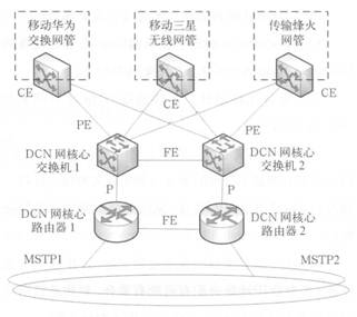 P路由器和PE設(shè)備為口字形連接,各自通過VRRP 協(xié)議進(jìn)行熱備。P設(shè)備直接通過FE口接入MSTP傳輸網(wǎng)。