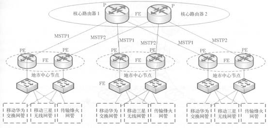 在地市分公司的中心節(jié)點(diǎn)配置兩臺(tái)中端PE路由器和兩臺(tái)以太網(wǎng)交換機(jī),負(fù)責(zé)各個(gè)業(yè)務(wù)網(wǎng)元、終端的規(guī)范接入,通過在交換機(jī)上劃分不同的VLAN對(duì)各個(gè)業(yè)務(wù)系統(tǒng)進(jìn)行隔離,各業(yè)務(wù)接入到各自的VPN中。PE