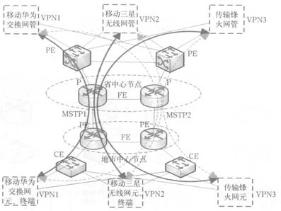 采用MPLS VPN技術(shù)可以把現(xiàn)有的物理實(shí)體IP網(wǎng)絡(luò)分解成邏輯上隔離的網(wǎng)絡(luò),各隔離開的網(wǎng)絡(luò)之間感知不到對(duì)方網(wǎng)絡(luò)的存在。在物理上是同一硬件設(shè)備承載,但在邏輯上網(wǎng)絡(luò)是完全隔離的。0SS承載網(wǎng)正是需要這樣的一種承載方式,把各專業(yè)各廠家的多種網(wǎng)管配置到不同的邏輯業(yè)務(wù)區(qū)VPN中,如移動(dòng)華為交換網(wǎng)管配置到VPNl中,移動(dòng)三星無線網(wǎng)管配置到VPN2中,傳輸烽火網(wǎng)管配置到VPN3中,對(duì)每一套網(wǎng)管系統(tǒng)都使用同樣的物理承載不同的VPN完成從地市分公司的網(wǎng)元或終端到網(wǎng)管服務(wù)器的連接,各VPN之間相互獨(dú)立、相互隔離。