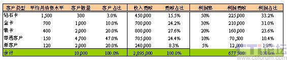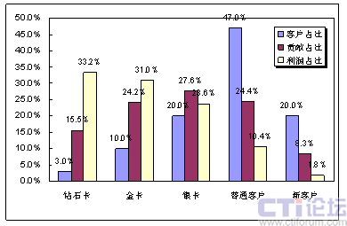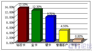 因?yàn)楦叨丝蛻粼诶麧?rùn)貢獻(xiàn)中所起的巨大作用,通過(guò)簡(jiǎn)單的計(jì)算即可得出,每一名鉆石卡客戶流失帶來(lái)的利潤(rùn)損失,相當(dāng)于9.4名銀卡客戶流失帶來(lái)的損失,或相當(dāng)于50名普通客戶流失帶來(lái)的損失,或相當(dāng)于125名新用戶流失帶來(lái)的直接損失。