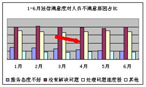 客服代表的工作情緒及客戶滿意度呈現(xiàn)上升趨勢:3-6月的短信滿意度穩(wěn)步提升(見下圖1),6月短信滿意度較3月提升1.25個百分點(diǎn),短信滿意度調(diào)查中“非常滿意”項(xiàng)占比自4月份開上升1.42個百分點(diǎn)(見下圖2)。從客戶不滿意原因情況看,由于人員導(dǎo)致客戶不滿意的比例下降0.6%(見下圖3);對導(dǎo)致人員不滿意的原因分析可知,話務(wù)員服務(wù)態(tài)度不好的占比有明顯的下降(見下圖4)。