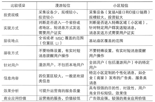 兩個(gè)系統(tǒng)最大的不同點(diǎn)是接收短信的范圍和用戶不一樣,漫游短信是針對漫游用戶在一個(gè)相對較大區(qū)域內(nèi),因此只適合運(yùn)營商發(fā)一般性的問候短信,提高運(yùn)營商的服務(wù)質(zhì)量;小區(qū)短信則是在一個(gè)較小的區(qū)域內(nèi)(特定地點(diǎn)),針對特定用戶(可能包括漫游用戶),在一個(gè)特定的時(shí)間,發(fā)送特定的消息,因此這種消息具有較強(qiáng)的針對性,具有較高的商業(yè)用戶價(jià)值,可用于企業(yè)(商家)發(fā)布廣告和服務(wù)類的信息,能夠成為一種典型的增值服務(wù)。