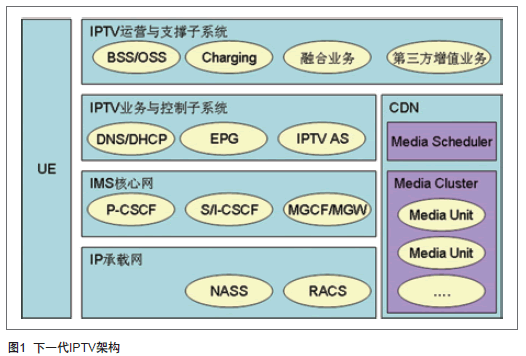 下一代IPTV架構(gòu)按功能屬性總體上劃分為UE、IPTV運營與支撐子系統(tǒng)、IPTV業(yè)務(wù)與控制子系統(tǒng)、CDN內(nèi)容分發(fā)網(wǎng)絡(luò)、IMS核心網(wǎng)和IP承載網(wǎng)五個子系統(tǒng),如圖1。