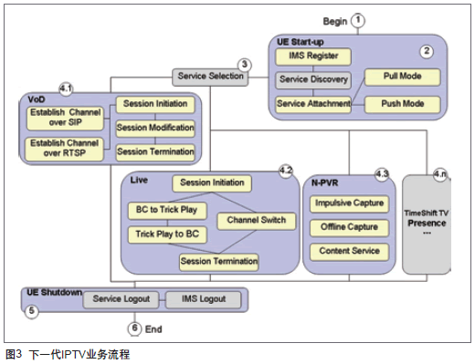 基于網(wǎng)絡(luò)視訊框架的下一代IPTV的業(yè)務(wù)流程具有完整的生命周期,其生命周期始于UE開機階段,活躍于業(yè)務(wù)使用階段,終止于UE關(guān)機階段,如圖3。其細分的業(yè)務(wù)流程包含以下6個子階段: