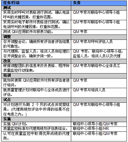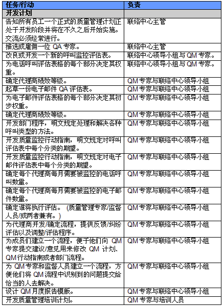 4. 開展項(xiàng)目交流。管理人員必須就新的或者修繕后的QM計(jì)劃與代理商進(jìn)行交流。QM的成功與否與代理商的合作密不可分,如果代理商受邀參與新QM計(jì)劃的開發(fā)并且所有改變都在雙方之間明確交流過,那么成功的機(jī)會也將大大提高。交流的內(nèi)容應(yīng)包括為什么要開發(fā)這樣一個(gè)計(jì)劃,它的作用和職責(zé)是什么,它對代理商會產(chǎn)生哪些影響(對于他們的評估和提升)以及它能帶來哪些好處。幫助代理商認(rèn)識到QM計(jì)劃積極的一面很重要,因?yàn)橹挥羞@樣才能讓他們看到QM不僅僅是管理人員用來告訴他們做錯(cuò)了事情的一種手段。讓聯(lián)絡(luò)中心全體員工參與QM計(jì)劃的開發(fā)能夠建立他們對該計(jì)劃的支持,提高接受度的同時(shí)避免不知所措。這對聯(lián)絡(luò)中心剛剛嶄露頭角,QM計(jì)劃還未全面鋪開的中國市場而言尤為重要。