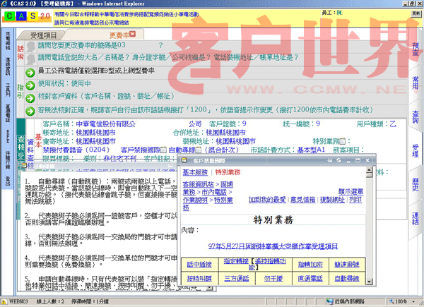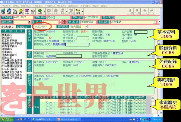 我們推動「CPEP客服流程提升計(jì)劃」的重點(diǎn)是在IVR流程中就請客戶自行輸入其欲查詢或辦理的電話號碼,同時客服系統(tǒng)便先透過EAI到后端信息系統(tǒng),查詢出該號碼的核心數(shù)據(jù)(含基本、帳務(wù)、欠費(fèi)記錄、來電歷史等),當(dāng)客服人員應(yīng)答時客服系統(tǒng)便立即將這些核心數(shù)據(jù)顯示在屏幕上(如圖一),客服人員便可立即掌握此客戶之相關(guān)資料,CPEP如此改善后平均的服務(wù)效率提升了11%。