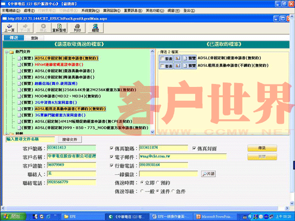EFE第一步先將所有的窗口、文件與數(shù)據(jù)轉(zhuǎn)為電子化的檔案,當(dāng)需要傳送書面文件給客戶時,客服人員可立即在在線點(diǎn)選以傳真或電子郵件將文件傳給客戶(如圖二),傳送成功后并立即以SMS通知客戶。當(dāng)客戶反饋數(shù)據(jù)回來時,EFE會自動接收并存盤,接收成功后EFE則會立即發(fā)送SMS訊息給客戶安心,而且所有送出與接收文件都有完整記錄可共管理、追蹤與處理。