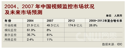IDC的數(shù)字同樣樂(lè)觀。跟據(jù)IDC在2008年的預(yù)測(cè),2008~2012年,中國(guó)視頻監(jiān)控市場(chǎng)的年均復(fù)合增長(zhǎng)率將達(dá)28.8%,遠(yuǎn)高于IT市場(chǎng)投入的平均增長(zhǎng)率。而在模擬、數(shù)字與IP模式(即網(wǎng)絡(luò)監(jiān)控)組成的視頻監(jiān)控市場(chǎng)里,IP的增長(zhǎng)率又將高于前二者,成為市場(chǎng)增長(zhǎng)的強(qiáng)勁動(dòng)力!保ㄗⅲ耗M監(jiān)控是指圖像信號(hào)在采集后,通過(guò)模擬信號(hào)傳輸?shù)姆忾]式視頻監(jiān)控系統(tǒng)模式;數(shù)字監(jiān)控是指圖像信號(hào)在采集后,經(jīng)過(guò)編碼轉(zhuǎn)化成數(shù)字信號(hào)再進(jìn)行傳輸?shù)姆忾]或半封閉式視頻監(jiān)控系統(tǒng)模式;網(wǎng)絡(luò)監(jiān)控是指系統(tǒng)建立在以網(wǎng)絡(luò)為基礎(chǔ)的傳輸平臺(tái)的開放式視頻監(jiān)控系統(tǒng)模式)。