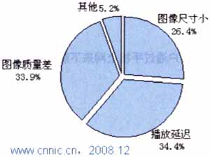 對(duì)于手機(jī)視頻用戶(hù)而言,目前最大的問(wèn)題在于視頻圖像的播放延遲問(wèn)題以及圖像質(zhì)量太差,兩者比例分別為 34.4%和33.9%。引起這兩種問(wèn)題的最大因素是電信運(yùn)營(yíng)商的網(wǎng)絡(luò)問(wèn)題,目前的2.5G和2.75G網(wǎng)絡(luò)對(duì)于數(shù)據(jù)的快速傳輸仍有很大的瓶頸。