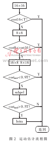 (4)算法替代和改進(jìn)。幀間預(yù)測(cè)的改進(jìn):關(guān)于算法的改進(jìn)主要集中在對(duì)me(motion estimation)的改進(jìn)上,流程如圖2所示。costmin1=min(cost16,cost8,cost16×8,cost8×16),costmin2=min(costmin1,costsub),依次在16×16、8×8、16×8和8×16大小宏塊的整像素位置做預(yù)測(cè),再做次像素估計(jì)和幀內(nèi)預(yù)測(cè),選用匹配準(zhǔn)則函數(shù)(采用sad作為匹配準(zhǔn)則函數(shù))取得最小值的模式進(jìn)行編碼。每計(jì)算一種模式,都將sad值與一個(gè)經(jīng)驗(yàn)閥值做比較。當(dāng)sad值小于這個(gè)閥值時(shí),立即結(jié)束運(yùn)動(dòng)估計(jì),從而減少運(yùn)算量。