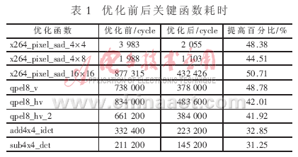采用以上優(yōu)化方法對(duì)編碼關(guān)鍵函數(shù)進(jìn)行優(yōu)化,優(yōu)化前后函數(shù)耗時(shí)如表1所示?梢姡陨蟽(yōu)化方法能大幅度減少編碼時(shí)間。