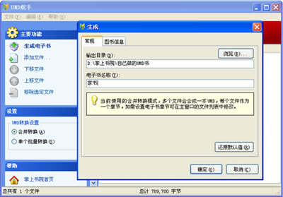 點(diǎn)擊“添加文件”,將你想要轉(zhuǎn)換的電子書(shū)添加至軟件窗口,大批量轉(zhuǎn)換的用戶(hù)可一次性選中多個(gè)文件添加,添加完畢后,你可以隨時(shí)通過(guò)“上移文件”和“下移文件”按鈕來(lái)調(diào)整你文件擺放的位置,或者移除不需要轉(zhuǎn)換的文件。確認(rèn)后,選擇合并轉(zhuǎn)換或是單個(gè)批量轉(zhuǎn)換,合并轉(zhuǎn)換是將添加的文件合并成一本UMD電子書(shū),單個(gè)批量轉(zhuǎn)換是每個(gè)文件生成一本UMD電子書(shū)。設(shè)置完后點(diǎn)擊“生成電子書(shū)”,在彈出的對(duì)話框中設(shè)置輸出目錄、電子書(shū)名稱(chēng)、電子書(shū)封面、作者、來(lái)源后點(diǎn)擊確認(rèn),出現(xiàn)正在轉(zhuǎn)換的進(jìn)度條,完成制作后會(huì)自動(dòng)打開(kāi)電子書(shū)所在的目錄,你的電子書(shū)制作完成,是不是非常簡(jiǎn)單。