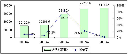 圖2 2004-2008年中國(guó)移動(dòng)通信卡市場(chǎng)規(guī)模與增長(zhǎng)(按銷(xiāo)量)