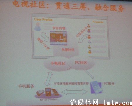 百視通在數(shù)月前便發(fā)布了三屏融合戰(zhàn)略,據(jù)李川介紹,百視通是從節(jié)目分享開始著手的。比如發(fā)一個(gè)片花到手機(jī)上,用戶喜歡的話可以定制,IPTV上設(shè)一個(gè)入口,兩相對(duì)接,用戶點(diǎn)一兩個(gè)鍵就可以很方便的看到他需要的視頻,從而解決了不斷翻頁(yè)造成用戶流失的問題。而在電腦上,也可以實(shí)現(xiàn)這樣的定制,甚至是異地傳送。亦即即使出差在外地,也可以很簡(jiǎn)單的通過互聯(lián)網(wǎng)定制IPTV節(jié)目送給家人、朋友。