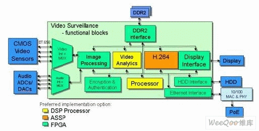 經(jīng)過壓縮后的數(shù)據(jù)通過硬盤驅動器接口存儲至視頻存儲服務器,或通過以太網(wǎng)網(wǎng)絡發(fā)送。視頻數(shù)據(jù)傳送到顯示器之前通常是取自硬盤驅動器,并經(jīng)過了解碼以及一些圖像后處理,如縮放、色彩空間轉換或覆蓋應用。通常情況下,存儲器接口(如DDR2)是用來存儲視頻幀。此外,某些系統(tǒng)要求視頻內(nèi)容的實時加密以確保安全和源/用戶身份驗證。最后,需要用處理器控制和協(xié)調(diào)/排定各種不同的任務。