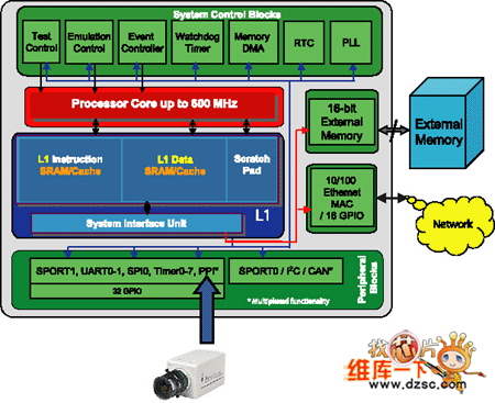 美國(guó)模擬器件公司(ADI)最新推出的ADSP-BF537為網(wǎng)絡(luò)視頻應(yīng)用的提供了一個(gè)良好的平臺(tái)。ADSP-BF537不僅有一個(gè)高性能的處理器內(nèi)核,還有高速的并行外圍接口(PPI)和一個(gè)片內(nèi)的10/100以太網(wǎng)MAC端口,其結(jié)構(gòu)如圖所示。