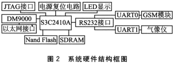 監(jiān)控系統(tǒng)控制器的核心CPU選用基于ARM920T內(nèi)核的16/32位RISC處理器 S3C2410A。該處理器功能強(qiáng)、性?xún)r(jià)比高、功耗低,提供了一套較完整的通用外圍設(shè)備接口,帶MMU(內(nèi)存管理單元),可支持Linux、μC/OS- II、WindowsCE等多種操作系統(tǒng)的移植。系統(tǒng)硬件結(jié)構(gòu)框圖如圖2所示。