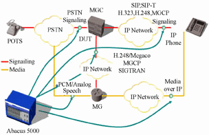 例如,運(yùn)營商在部署VoIP網(wǎng)絡(luò)時,有可能會采用A廠家的軟交換和B廠家的接入網(wǎng)關(guān)設(shè)備,如何確認(rèn)這兩家的設(shè)備在一起互通時沒有性能上的問題?這時可以采用儀表仿真接入網(wǎng)關(guān)下面的模擬線終端,往網(wǎng)關(guān)和軟交換側(cè)發(fā)起呼叫,再由軟交換將呼叫路由回網(wǎng)關(guān)再到終端。通過這種方式,由儀表發(fā)起成千上萬的呼叫經(jīng)過接入網(wǎng)關(guān)和軟交換,可以有效地驗(yàn)證這兩種設(shè)備在互通的時候有沒有性能和穩(wěn)定性問題。