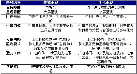 另外通過在終端支撐、網(wǎng)絡(luò)傳輸、盈利模式和覆蓋用戶來看,手機(jī)電視產(chǎn)業(yè)和傳統(tǒng)電視也存在著比較大的差異: