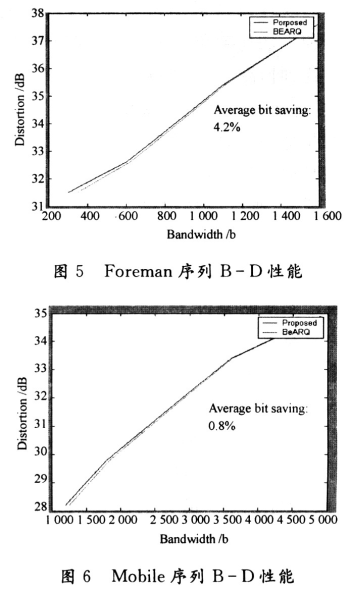 將圖4~圖6對比可以看出,對于運(yùn)動程度很低且紋理相對平緩的Akiyo序列來說,相對盡力而為ARQ機(jī)制,本文的機(jī)制在3%的丟包情形下可以節(jié)省20%以上的帶寬。而對運(yùn)動較為劇烈的Foreman序列來說,則只能節(jié)省4%的帶寬。對紋理很復(fù)雜的Mobile序列,本文的算法相對于BEARQ,帶寬僅節(jié)省不到1%。從表1的重發(fā)率和圖4~圖6的對應(yīng)關(guān)系不難看出,重發(fā)率越高,則對應(yīng)B-D性能的改善程度就越低。因此可以說實驗仿真表明了本文提出的傳輸控制算法,能夠在保證視頻接收質(zhì)量的同時,有效降低傳輸所用帶寬。