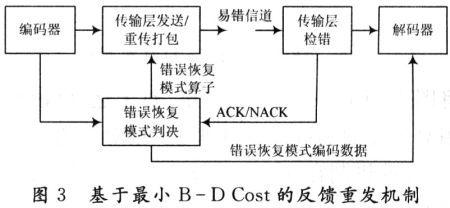 式中:rg是指出錯的部分被正確重傳到接收端的比特數(shù)。當(dāng)r0≥(1-p)r+pr/(1-p)時,所有出錯的比特都實現(xiàn)了重傳,所以終端接收失真等于編碼端失真。否則,則按照式(7)中的兩個關(guān)系式,即可得到d0關(guān)于r0的表達(dá)式(5)。確立了上述關(guān)系后,結(jié)合相關(guān)的容錯平臺,設(shè)計出基于B-DCost的反饋重發(fā)機(jī)制,其原理框圖如圖3所示。
