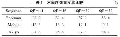 為了更全面評價本算法的性能,對不同測試序列在同樣丟包率情況下對本章的機(jī)制進(jìn)行性能測試?紤]到影響本章算法性能的包括序列的紋理復(fù)雜程度以及運(yùn)動劇烈程度。這里利用運(yùn)動較為劇烈但紋理相對較單一的Foreman序列,紋理復(fù)雜程度較高的Mobile以及運(yùn)動程度較低的Akiyo序列作為評測序列。表1是對這三個測試序列在QP=14,16,20,22,丟包率為3%的情況下前100幀做的統(tǒng)計,其中出錯Slice個數(shù)為24,則出錯宏塊總數(shù)為24×11=264。令NMB=264,則根據(jù)模式判決結(jié)果,即可得到對重發(fā)率的統(tǒng)計。