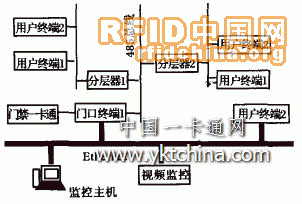 系統(tǒng)采用了兩套獨立的網(wǎng)絡(luò)系統(tǒng),第一套是基于485總線半雙工網(wǎng)絡(luò)系統(tǒng),第二套是基于以太網(wǎng)的局域網(wǎng)。基于485總線半雙工網(wǎng)絡(luò)系統(tǒng)用以連接門口終端、分層器和用戶終端,這主要是從成本上考慮。由于這三部分交換的信息比較少,數(shù)據(jù)交換的速度要求也不是很高而且實現(xiàn)比較簡單,故采用了這種網(wǎng)絡(luò)系統(tǒng)。